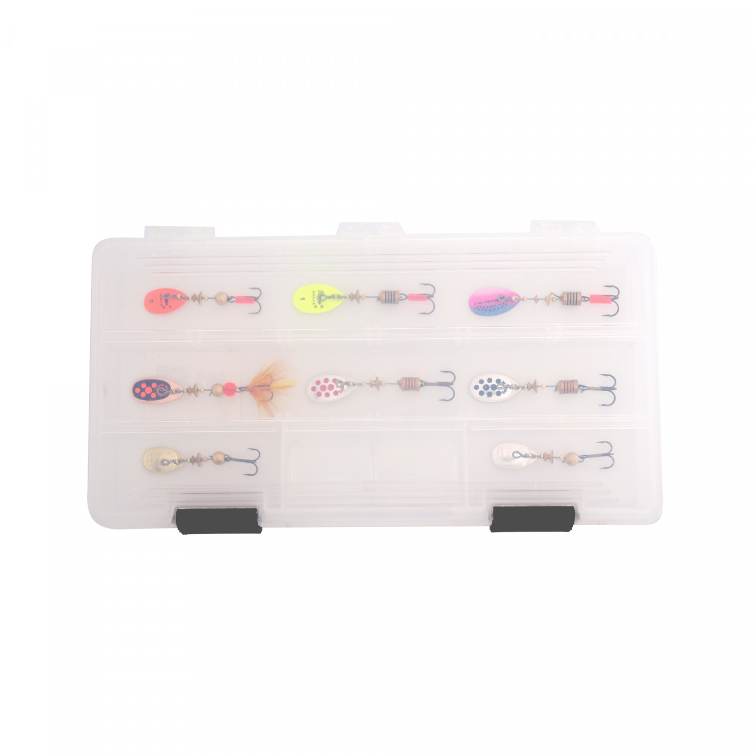 A convenient, transparent, 23 x 12 x 3.5cm tackle box to keep the Mepps Aglia spinners well organized.